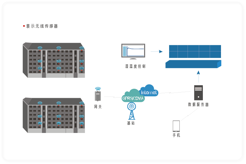 居民室內(nèi)安裝無線溫度傳感器,周期性采集環(huán)境溫度數(shù)據(jù)并上報(bào)到網(wǎng)關(guān),再由網(wǎng)關(guān)通過GPRS或CDMA方式上傳至互聯(lián)網(wǎng)中的